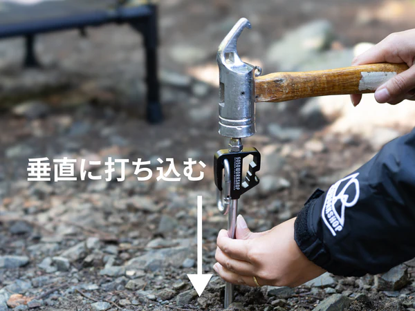 地面に打ち込む‥硬く締まった地面にハンマーなどを用いて本体を回転部分50-100mm位まで垂直に打ち込みます。