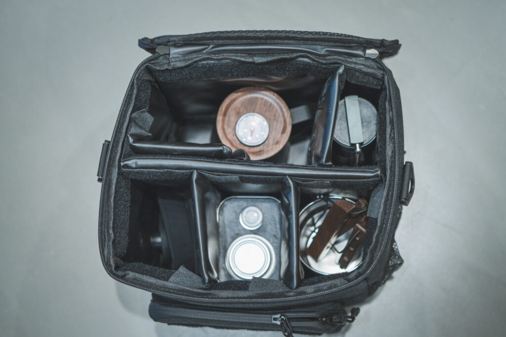 蓋部分にブラックウォルナットを採用。コーヒーを淹れる際のお湯の適度を分かりやすく表示してあります。